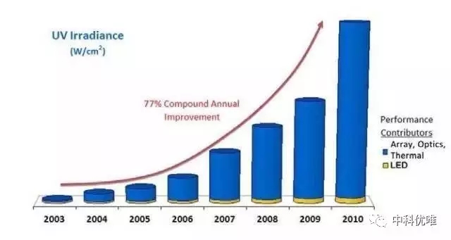 uvled光固化機(jī)的輸出功率在最近幾年得到了相當(dāng)大的提高,從若干家供應(yīng)商所提供的產(chǎn)品指標(biāo)數(shù)據(jù)可以看出,從2005年到2011年輸出功率的復(fù)合年均增長(zhǎng)率在5%到10%之間。但對(duì)于LED整體表現(xiàn)的評(píng)估,另外三個(gè)因素對(duì)于增加LED的效能更加重要:陣列、冷卻和光學(xué)系統(tǒng)。