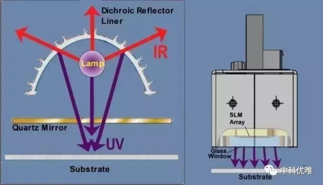 基于最終的應(yīng)用需求,光學(xué)工程師必須決定應(yīng)該采用何種形狀、形式以及材質(zhì)來(lái)最好地利用LED的獨(dú)特性能,然后還需要注意LED是一種泛光形式的光,而不像汞燈模式中紫外光被反射罩反射并指向特定的點(diǎn)并具有一定的聚焦長(zhǎng)度。下圖標(biāo)出了傳統(tǒng)汞燈和UV LED燈在這一點(diǎn)上面的不同。